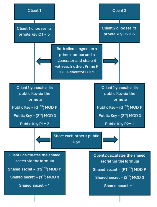 The Dragonfly handshake is based on the Diffie-Hellman (DH) handshake. The DH handshake uses a Prime number and a generator which are publicly exchanged alongwith private keys to compute a shared secret. The Diffie-hellman handshake can be best understood by a pictorial description as shown below (where MOD stands for modulo operation):